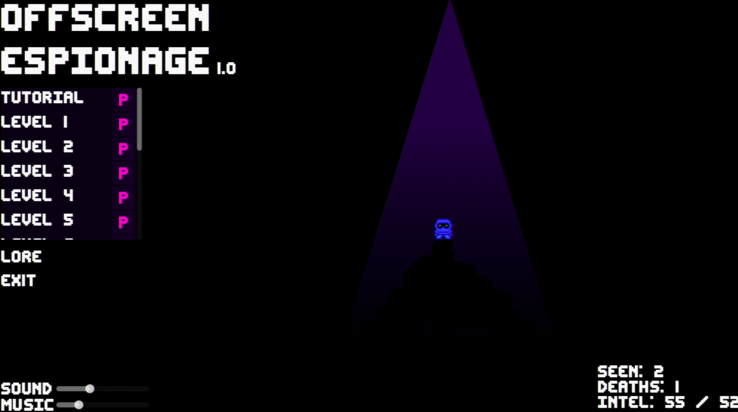In Offscreen Espionage you must stealthily clear 12 levels while using your ability to freeze the camera and walk off the screen to go through walls and evade enemy sight.